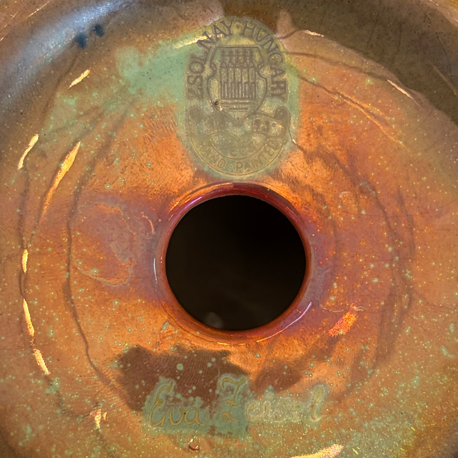One large iridescent bronze glazed votive holder produced by Zsolnay for The Orange Chicken. New original condition. Signed and stamped on bottom.